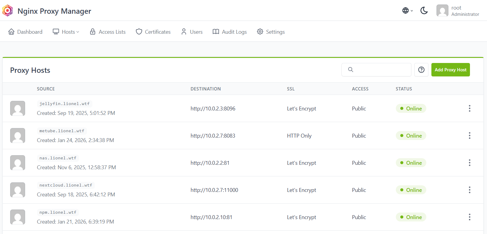 Die reverse proxy fungeert als tussenlaag en routeert het verkeer op basis van het subdomein naar een intern IP-adres en poort. Hierdoor kan ik meerdere webservices hosten zonder dat ze allemaal rechtstreeks op poort 80 of 443 hoeven te luisteren.